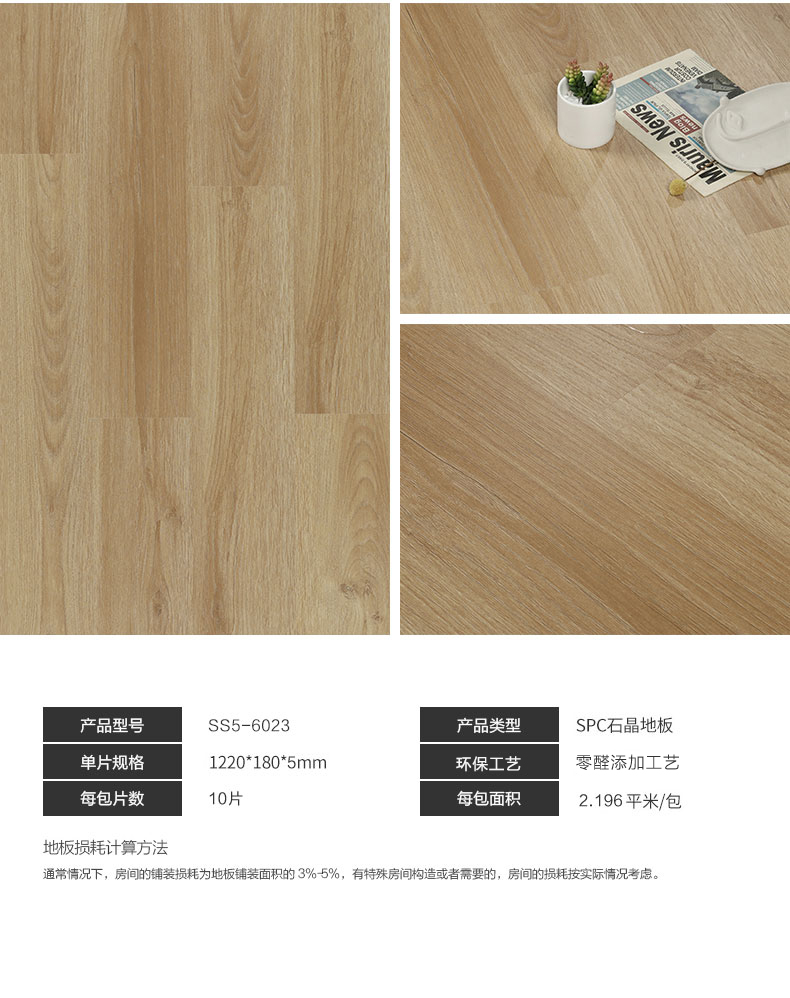 贝尔地板 SPC生态石晶地板 绿色防火 防水防火 5mm SS5-6023 1220*180*5+0(0.3)/10P