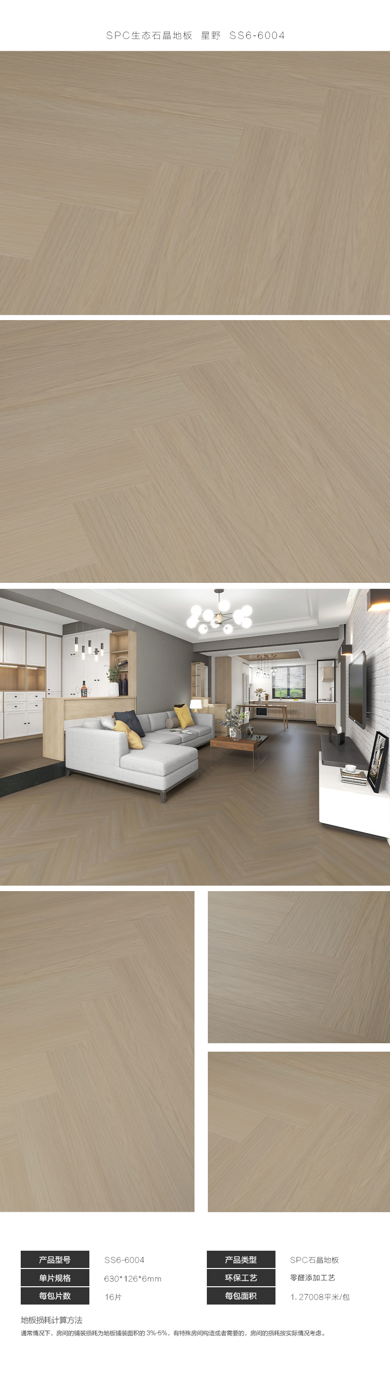 贝尔地板 SPC生态石晶地板 人字拼 6mm BBL-SS6-6004 630*126*6+0(0.5)/16P