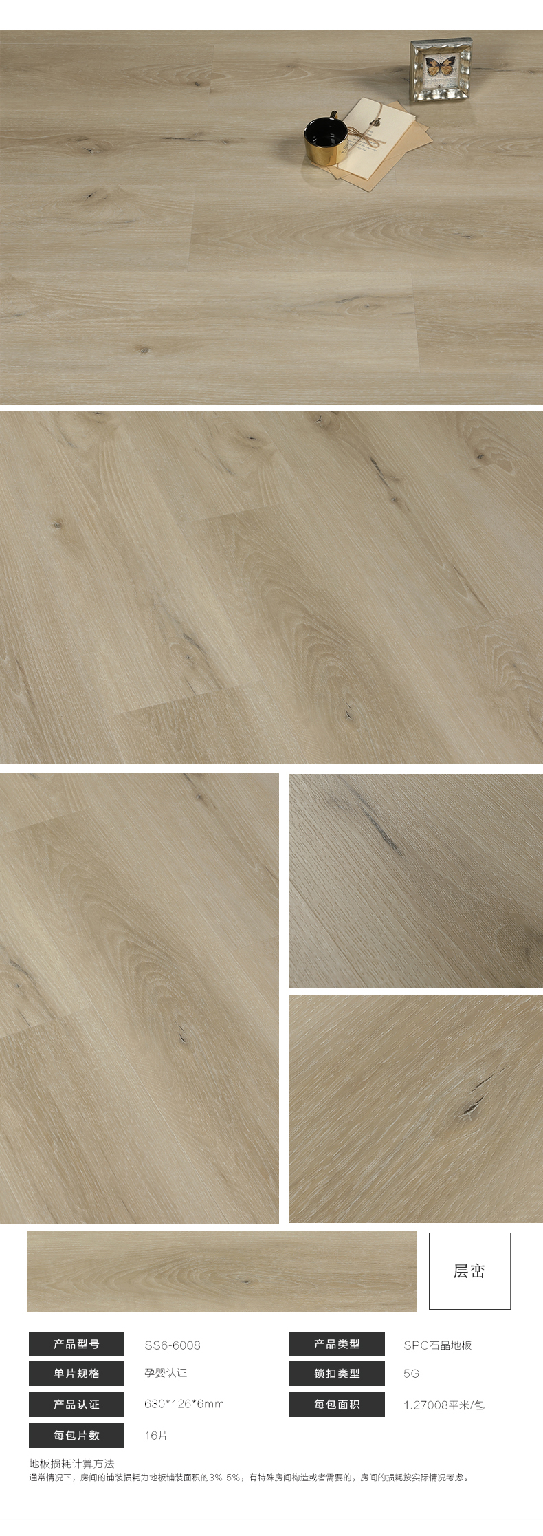 贝尔地板 SPC生态石晶地板 6mm SS6-5008 1220*181*6+0(0.5)/7P