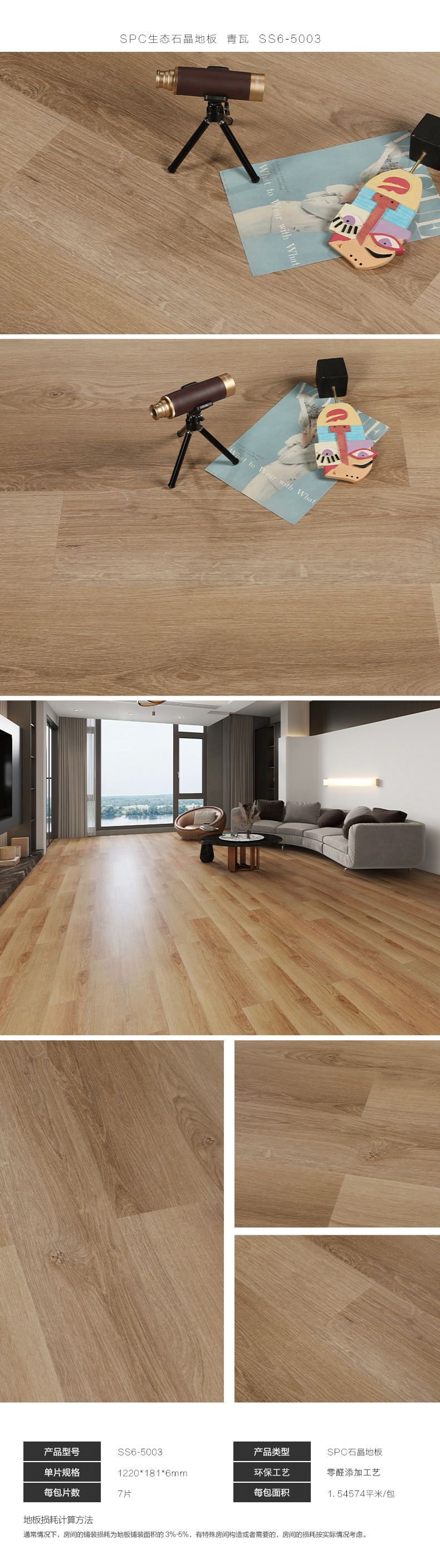 贝尔地板 SPC生态石晶地板 6mm SS6-5003 1220*181*6+0(0.5)/7P