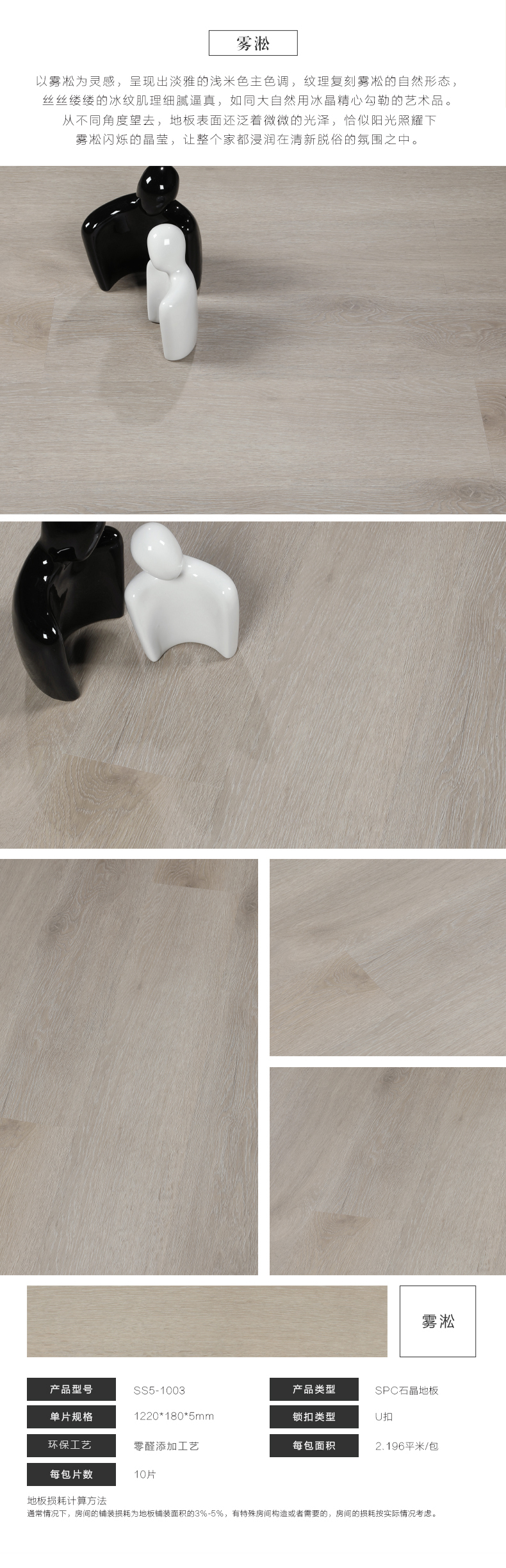 贝尔地板 SPC生态石晶地板 5mm SS5-1003 1220*180*5+0(0.3)/10P