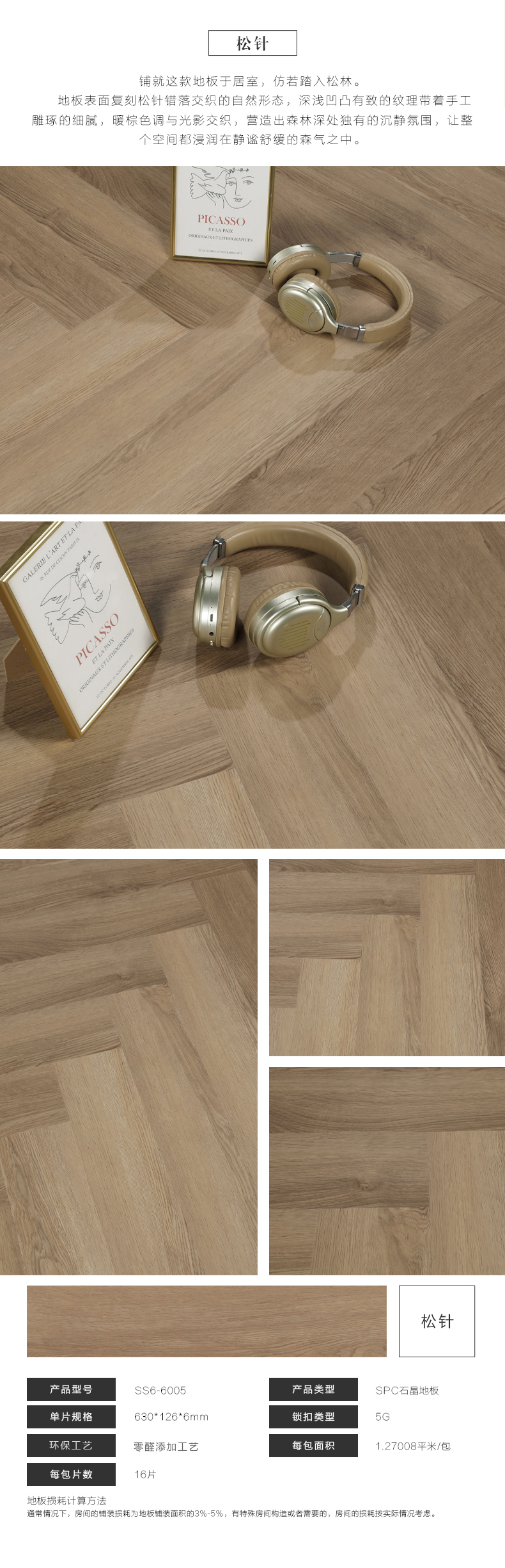 贝尔地板 SPC生态石晶地板 人字拼 6mm SS6-6005 630*126*6+0(0.5)/16P