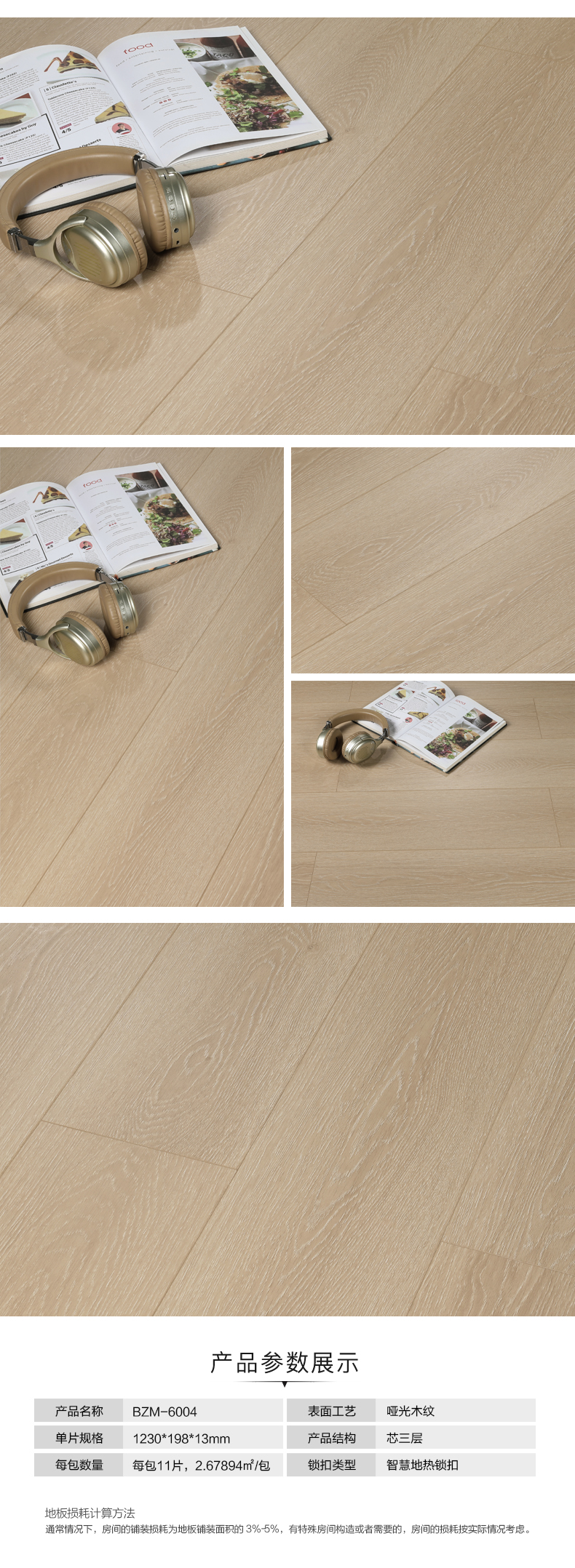 贝尔地板 优+系列 耐磨面新三层实木复合地板 BZM-6004饰面新三层 13mm