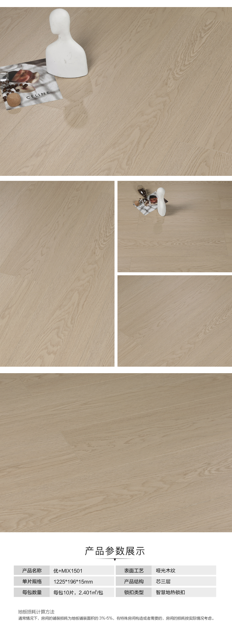贝尔地板 优+系列 耐磨面新三层实木复合地板 优+MIX1501饰面新三层 15mm